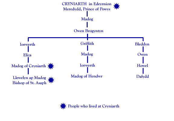 The family tree below shows hereditary associations with 'Cryniarth of Edeyrnion'. The head of the tree being Meredydd Prince of Powys (b1046 d1132 circa). The term 'Prince' in Welsh History is in direct relation to the term 'King' in English History. Five generations after Meredydd Prince of Powys is Madog of Cryniarth (1300 circa). Madog was the father of Llywelyn, who became the Bishop of St. Asaph. Llywelyn was born in Cryniarth in 1320 circa (d 1375). |